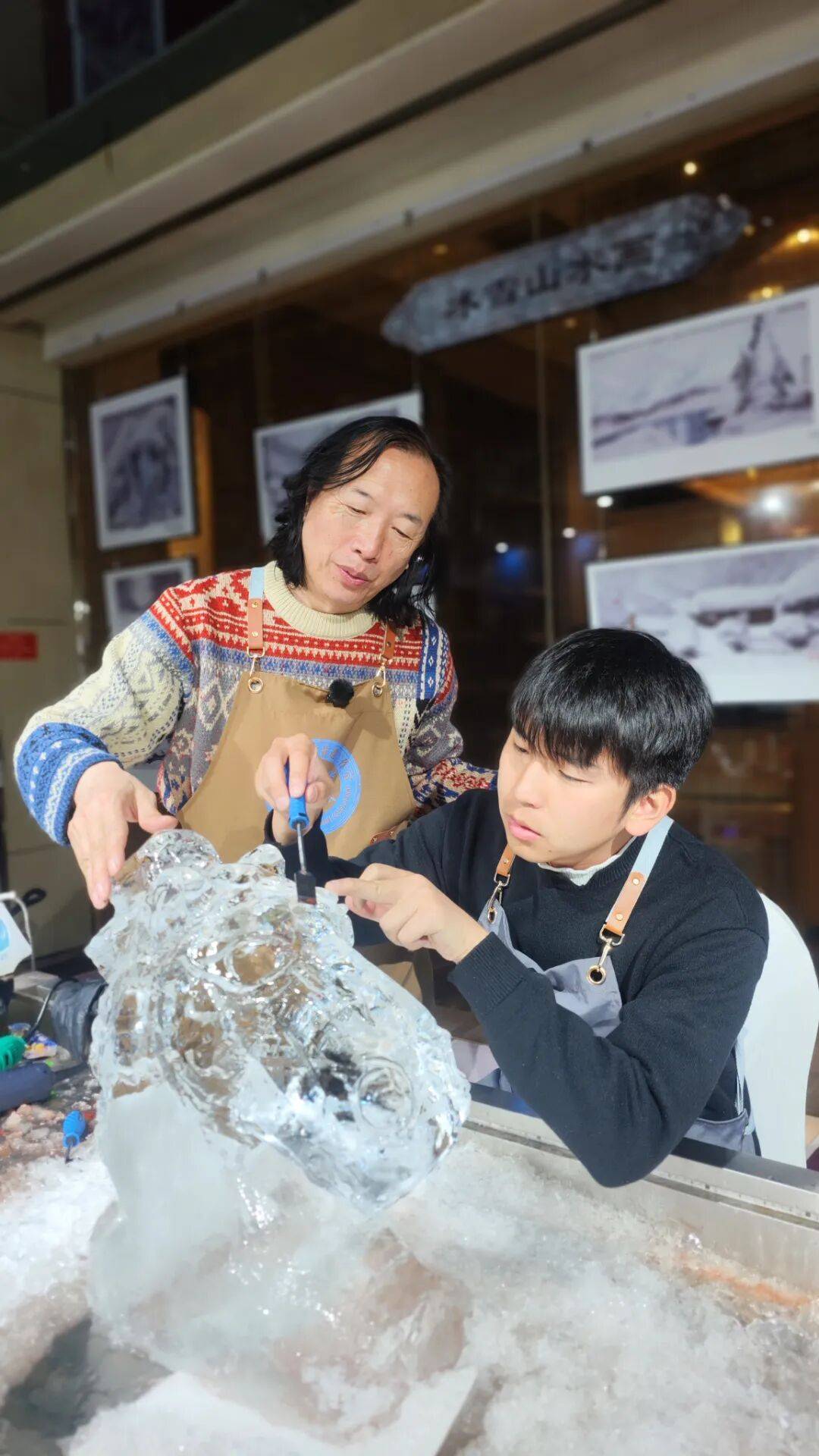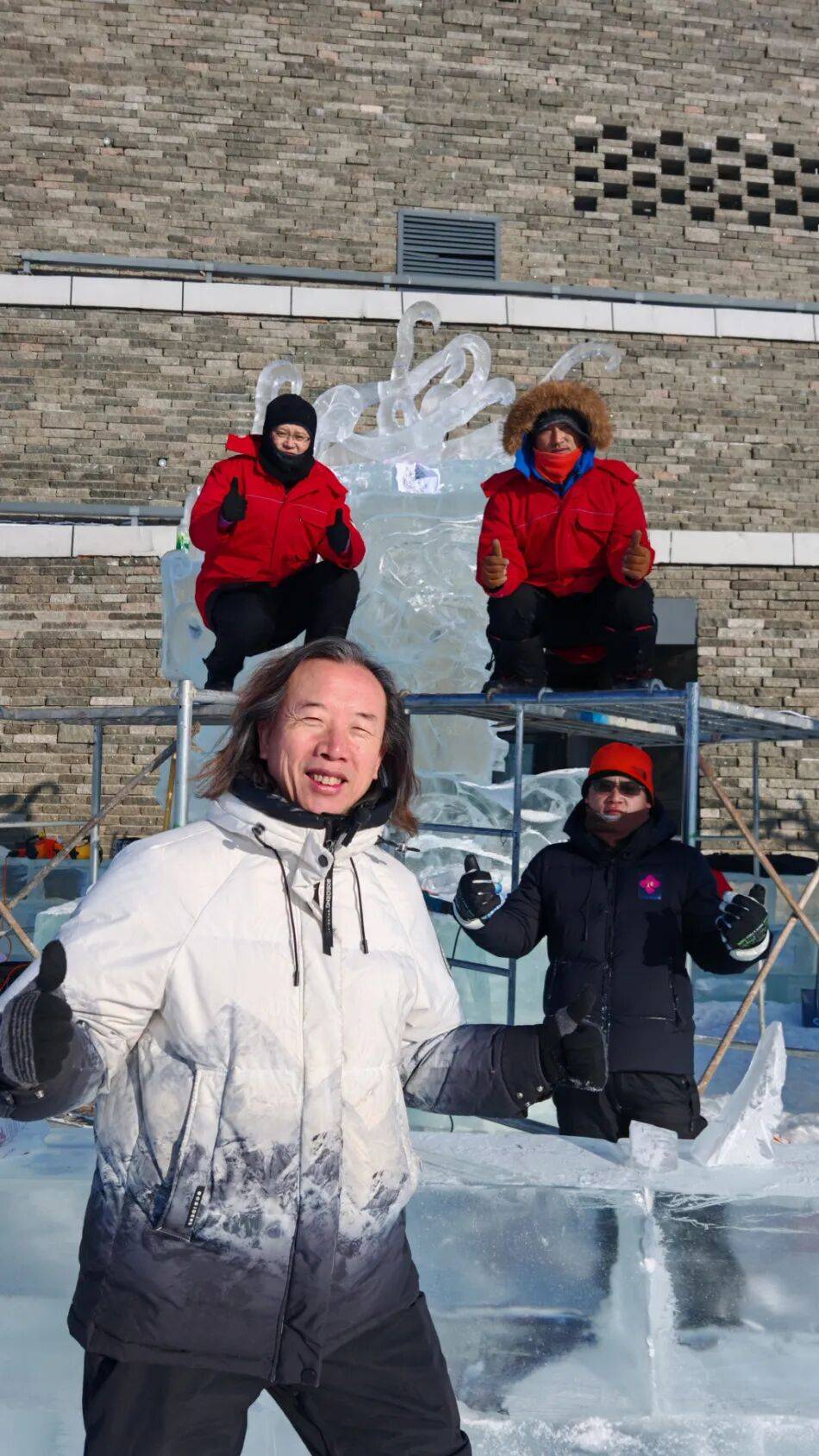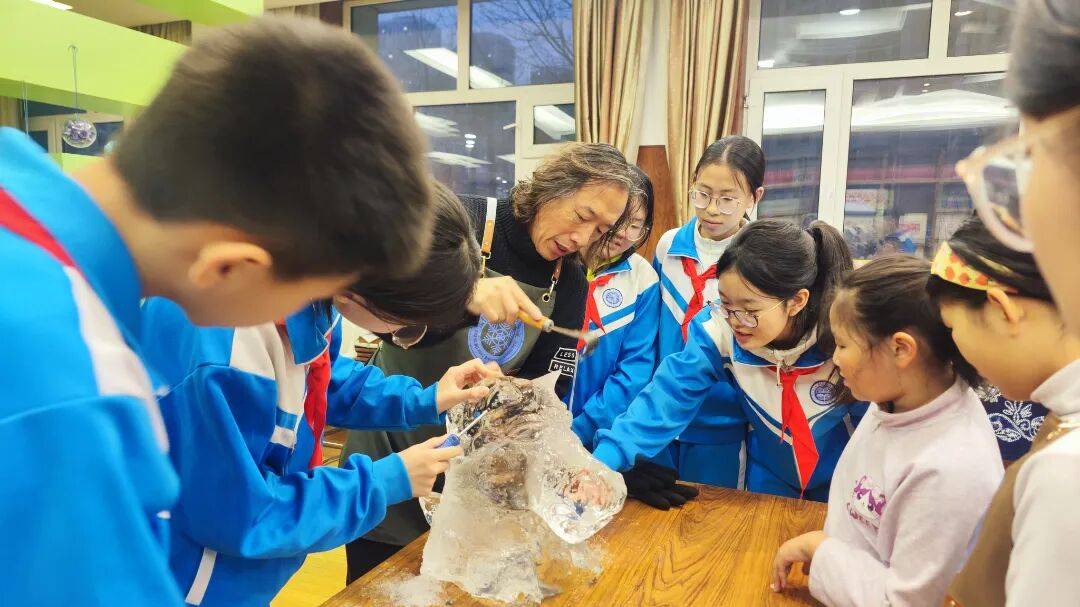 2023年,全省首家冰雪雕技艺非遗工坊在哈市香坊区铁东街道城东社区正式落成。这里开展活动300余场,惠及青少年5万人次。同年雷锋纪念日,团队走进香电社区开展非遗研学课程,被人民日报客户端专题报道。更令人瞩目的是冰雪非遗的国际传播。在哈尔滨奋斗小学校与哈尔滨冰雪文化博物馆共建的实践基地,张伟洪团队为俄罗斯柴可夫斯基少年艺术团传授技艺;在中职学校非遗馆,为央视《了不起的亚冬会》节目组展示冰雪雕魅力。亚冬会期间,团队在“冰雪大师工作坊”展示非遗技艺,吸引30余国运动员参与体验,相关视频全网播放量突破5亿人次。